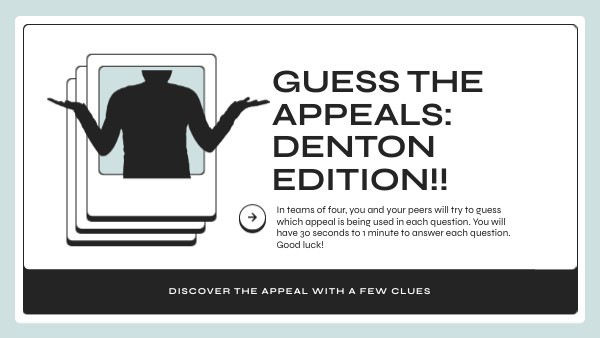 The purpose of this game is to help you solidify your understanding and evaluation of rhetorical appeals in writing, media, and beyond. Try to guess which appeal is being used on the slides. Give yourself 30 seconds to 1 minute to answer each question. Good luck!