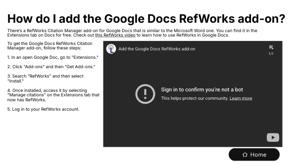 There’s a RefWorks Citation Manager add-on for Google Docs that is similar to the Microsoft Word one. You can find it in the Extensions tab on Docs for free. Check out this RefWorks video to learn how to use RefWorks in Google Docs.