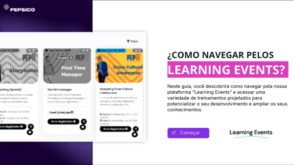 Neste guia, você descobrirá como navegar pela nossa plataforma “Learning Events” e acessar uma variedade de treinamentos projetados para potencializar o seu desenvolvimento e ampliar os seus conhecimentos.