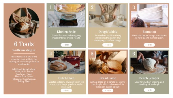 These tools are a few of the essentials that will help the making of a Sourdough Loaf so much easier. Additional Items Include: Glass Jar for StarterParchment Paper Elastic Food Covers Measuring Cups/Spoons Baking Sheet