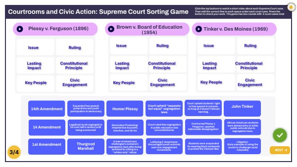 Click the top buttons to watch a short video about each Supreme Court case. Then add the correct tiles to each space under each court case. Press the button to check your work. The game has two rounds with 5 court cases total