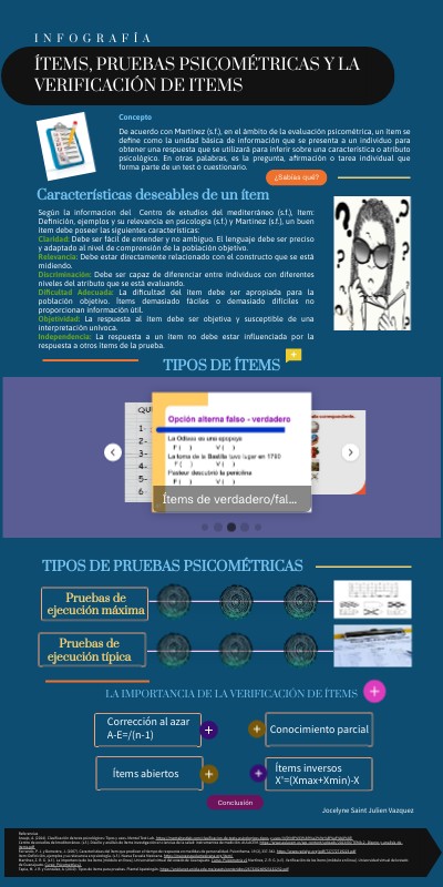 ReferenciasAraujo, A. (2024). Clasificación de tests psicológicos: Tipos y usos. Mental Test Lab. https://mentaltestlab.com/clasificacion-de-tests-psicologicos-tipos-y-usos-%f0%9f%93%89%e2%9c%8f%ef%b8%8f/ Centro de estudios del mediterráneo. (s.f.). Diseño y análisis de ítems investigación en ciencias de la salud: instrumentos de medición. AULACEM. https://www.aulacem.es/wp-content/uploads/2023/06/TEMA-2.-Diseno-y-analisis-de-items.pdf Ferrando, P. J. y Demestre, J. (2007). Características del ítem que predicen el tiempo de respuesta en medidas de personalidad. Psicothema. 19 (2),337-342. https://www.redalyc.org/pdf/727/72719223.pdf Item: Definición, ejemplos y su relevancia en psicología. (s.f.). Nueva Escuela Mexicana. https://nuevaescuelamexicana.org/item/ Martínez, Z. R. G. (s.f.). La importancia de los ítems [módulo en línea]. Universidad virtual del estado de Guanajuato. Curso: Psicometría v2 Martínez, Z. R. G. (s.f.). Verificación de los ítems [módulo en línea]. Universidad virtual del estado de Guanajuato. Curso: Psicometría v2 Tapia, M. J. R. y González, A. (2010). Tipos de items para pruebas. Plantel Apatzingán. https://uniclanet.unicla.edu.mx/assets/contenidos/267320240923132252.pdf