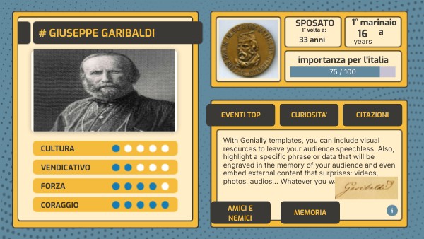 With Genially templates, you can include visual resources to leave your audience speechless. Also, highlight a specific phrase or data that will be engraved in the memory of your audience and even embed external content that surprises: videos, photos, audios... Whatever you want!