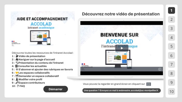 Découvrez toutes les ressources de l'intranet Accolad : 1 : 🎬Vidéo de présentation 2 : 🏠Naviguer sur la page d'accueil 3 : 📂Présentation du contenu de l'intranet 4: 📰Consulter les actualités 5 : ⭐S'abonner et ajouter des rubriques en favoris 6 : 🤝Les espaces collaboratifs 7 : 📝Demander un espace collaboratif 8 : 👤Modifier votre profil 9 : ✏️Espace contributeurs 10 :❓FAQ