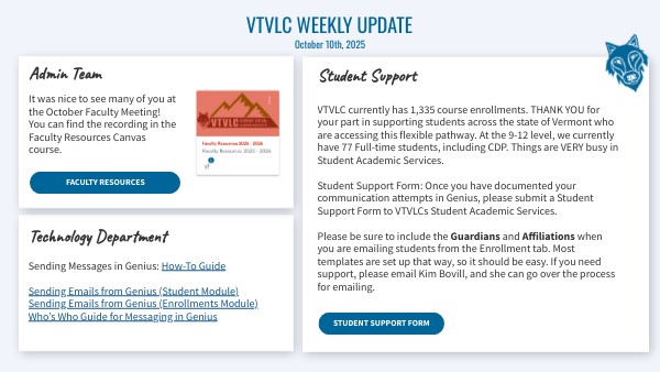 VTVLC currently has 1,335 course enrollments. THANK YOU for your part in supporting students across the state of Vermont who are accessing this flexible pathway. At the 9-12 level, we currently have 77 Full-time students, including CDP. Things are VERY busy in Student Academic Services. Student Support Form: Once you have documented your communication attempts in Genius, please submit a Student Support Form to VTVLCs Student Academic Services. Please be sure to include the Guardians and Affiliations when you are emailing students from the Enrollment tab. Most templates are set up that way, so it should be easy. If you need support, please email Kim Bovill, and she can go over the process for emailing.