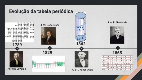 A.B. Chancourtois foi um geólogo francês que, em 1862, criou uma das primeiras tabelas periódicas, conhecida como o parafuso telúrico ou caracol de Chancourtois. Ele organizou os elementos em ordem crescente de massa atómica numa linha espiral num cilindro, observando que elementos com propriedades semelhantes apareciam em intervalos regulares