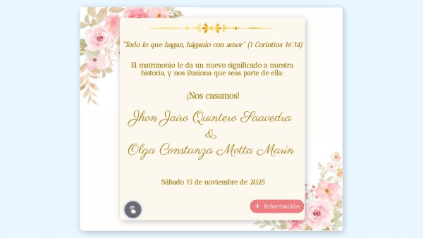 Te invitamos a ser parte de nuestro próximo gran paso juntos, el inicio de una nueva familia. En esta página encontrarás información relacionada a la celebración de nuestro matrimonio. Por favor, confirma tu asistencia antes del 1 de noviembre