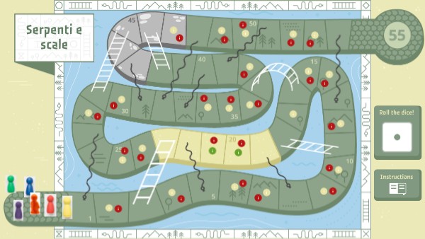 Le squadre giocano a turno, durante ogni turno gioca un solo giocatore della squadra. Il giocatore lancia il dato e si muove di tante caselle quante ne indica il dado. Se si atterra su una casella con la "i" bisogna rispondere alla domanda presente. Se si risponde correttamente si rimane nella casella, se si risponde in modo errato si retrocede sulla casella da dove si era lanciato il dado.Se si atterra su un serpente, leggere le istruzioni del riquadro "SERPENTE", se si atterra su una scala leggere le istruzioni del riquadro "SCALA". Se si estrae il numero 6, si può tirare il dado nuovamente e si avanzerà di un numero di caselle corrispondente alla somma dei due numeri. Se però la seconda volta si riestrae il 6 si deve tornare all'inizio del percorso. Vince la squadra che raggiunge per prima il termine del percorso, con un numero esatto di passi.