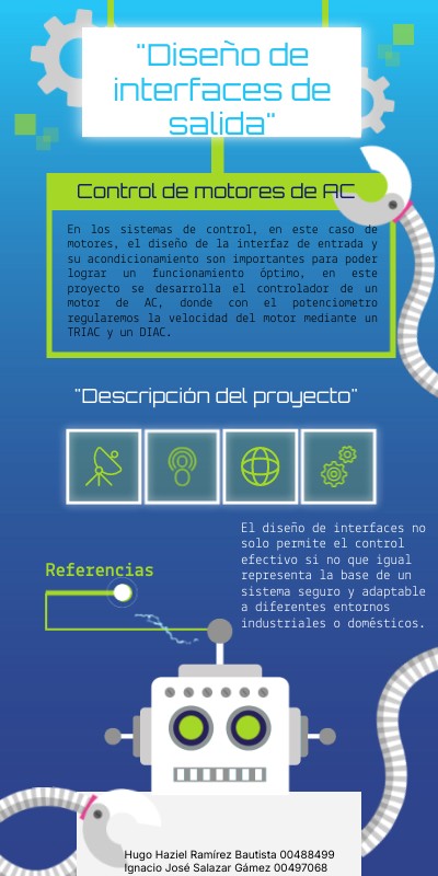 En los sistemas de control, en este caso de motores, el diseño de la interfaz de entrada y su acondicionamiento son importantes para poder lograr un funcionamiento óptimo, en este proyecto se desarrolla el controlador de un motor de AC, donde con el potenciometro regularemos la velocidad del motor mediante un TRIAC y un DIAC.