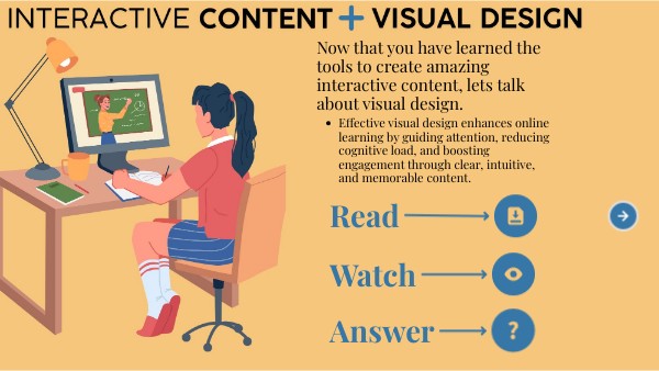 - Effective visual design enhances online learning by guiding attention, reducing cognitive load, and boosting engagement through clear, intuitive, and memorable content.