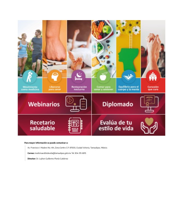 Av. Francisco I. Madero No. 414, Zona Centro C.P. 87000, Ciudad Victoria, Tamaulipas, México.Correo: medicinaestilodevida@tamaulipas.gob.mx