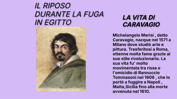 Michelangelo Merisi , detto Caravagio, nacque nel 1571 a Milano dove studiò arte e pittura. Trasferitosi a Roma, ottenne molta fame grazie al suo stile rivoluzionario. La sua vita fu' molto movimentata tra risse e l'omicidio di Rannuccio Tommasoni nel 1606 , che lo portò a fuggire a Napoli , Malta,Sicilia fino alla morte avvenuta nel 1610.