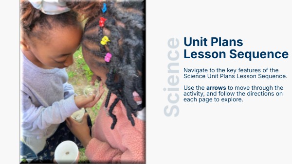 Navigate to the key features of the Science Unit Plans Lesson Sequence. Use the arrows to move through the activity, and follow the directions on each page to explore.