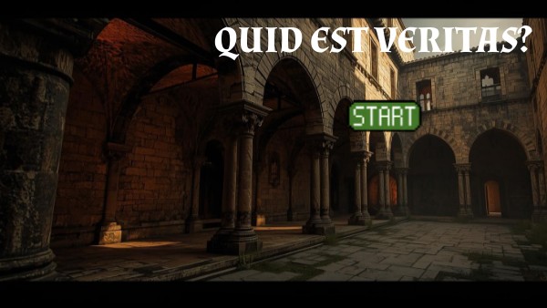 «Benvenuti, o cercatori della Verità.Finalmente siete giunti… vi attendevo da tempo. Le antiche mura di questo monastero hanno udito il vostro nome sussurrato dal vento, poiché siete stati scelti per un compito nobile e arduo. Come già vi dissi nella mia lettera, una sfida vi attende. Solo chi avrà cuore puro, mente vigile e spirito saldo potrà sostenerla. Se davvero desiderate conoscere che cosa sia la Veritas, dovrete attraversare le prove disseminate in questi luoghi di luce e d’ombra. E quando avrete sciolto ogni enigma e svelato ogni segreto, solo allora potrete rispondere alla mia domanda… “Quid est veritas?” — Che cos’è la Verità? Solo chi risponderà con saggezza potrà varcare di nuovo la soglia e tornare libero. Siete pronti, o viandanti dello spirito? Allora avanzate, e che la Luce vi accompagni nel vostro cammino.»