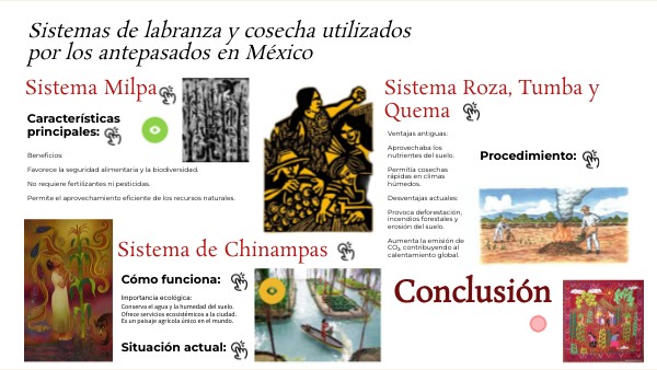 Los sistemas agrícolas ancestrales como la milpa, roza-tumba-quema y chinampas reflejan la sabiduría ecológica de los pueblos originarios. Su estudio y preservación pueden inspirar soluciones sostenibles para los retos agrícolas del México actual