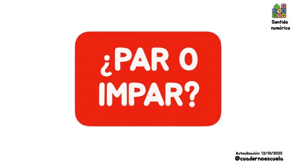 1. Creamos un número usando las regletas. 2. Repartimos los números en las casillas par e impar. 3. ¿Cómo hicimos el reparto? Si hay el mismo número en las dos casillas ... NÚMERO PAR. Si hay un número distinto en cada una de las casillas ... NÚMERO IMPAR. 4. ¿Todos de acuerdo? ¿Continuamos? ¿Repetimos?