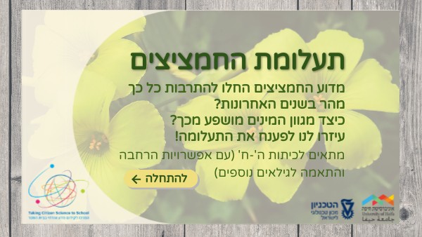 פרויקט "תעלומת החמציצים" הוא פרויקט מדע אזרחי חדש שמטרתו לדגום את טיפוסי החמציץ הנטוי בארץ וללמוד על דרכי רבייתו. מוביל המחקר: פרופ' עמרם אשל, אוניברסיטת תל אביב מובילת הפרויקט: שירי קאשי, מרכז TCSS קהל היעד: תלמידי כיתות ה'-ח' היקף הפעילות: 6 שעות שעות הוראה הכוללת יציאה אחת לשטח