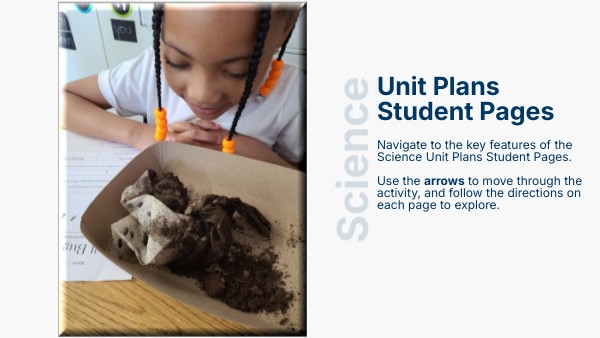 Navigate to the key features of the Science Unit Plans Student Pages. Use the arrows to move through the activity, and follow the directions on each page to explore.