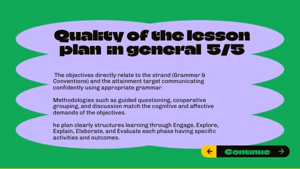 The objectives directly relate to the strand (Grammar & Conventions) and the attainment target communicating confidently using appropriate grammar. Methodologies such as guided questioning, cooperative grouping, and discussion match the cognitive and affective demands of the objectives. he plan clearly structures learning through Engage, Explore, Explain, Elaborate, and Evaluate each phase having specific activities and outcomes.