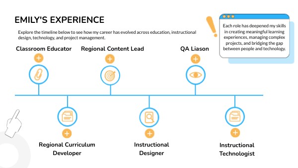 Explore the timeline below to see how my career has evolved across education, instructional design, technology, and project management.