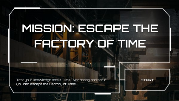 You have found yourself trapped inside an old, mysterious factory. The machines still hum, and there is a strange feeling in the air as if time itself might be working differently here. Some say this factory holds secrets about the magic spring from Tuck Everlasting. To escape, you will need to explore each part of the factory in order. At every stop, you will answer vocabulary questions from Tuck Everlasting, Chapters 20 through the Epilogue. Each correct answer will unlock the next area and bring you closer to the exit. Be smart, think carefully, and use what you have learned about the Tucks, Winnie, and the choices they made. Only then can you escape the Factory of Time. Your adventure starts now.