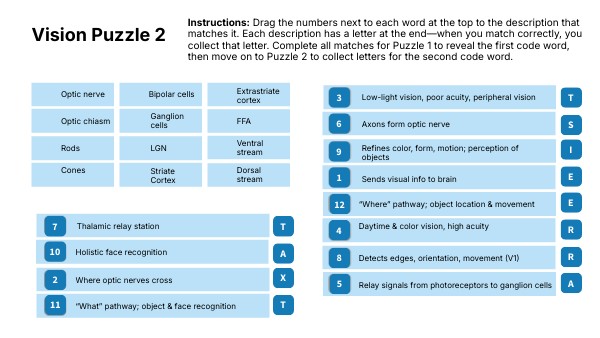 Instructions: Drag the numbers next to each word at the top to the description that matches it. Each description has a letter at the end—when you match correctly, you collect that letter. Complete all matches for Puzzle 1 to reveal the first code word, then move on to Puzzle 2 to collect letters for the second code word.