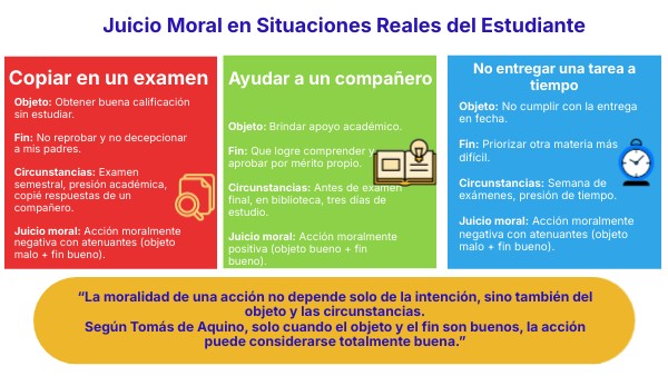Objeto: Obtener buena calificación sin estudiar. Fin: No reprobar y no decepcionar a mis padres. Circunstancias: Examen semestral, presión académica, copié respuestas de un compañero. Juicio moral: Acción moralmente negativa con atenuantes (objeto malo + fin bueno).