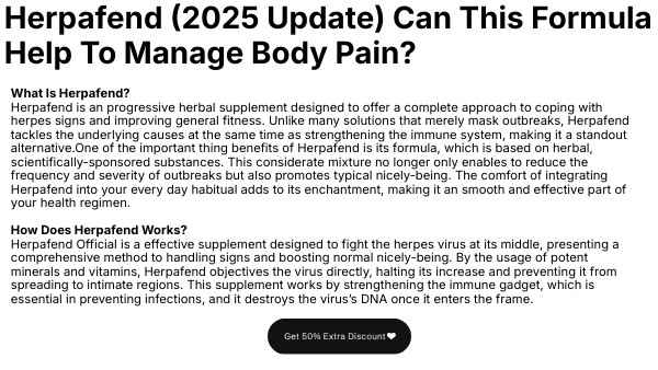 What Is Herpafend? Herpafend is an progressive herbal supplement designed to offer a complete approach to coping with herpes signs and improving general fitness. Unlike many solutions that merely mask outbreaks, Herpafend tackles the underlying causes at the same time as strengthening the immune system, making it a standout alternative.One of the important thing benefits of Herpafend is its formula, which is based on herbal, scientifically-sponsored substances. This considerate mixture no longer only enables to reduce the frequency and severity of outbreaks but also promotes typical nicely-being. The comfort of integrating Herpafend into your every day habitual adds to its enchantment, making it an smooth and effective part of your health regimen. How Does Herpafend Works? Herpafend Official is a effective supplement designed to fight the herpes virus at its middle, presenting a comprehensive method to handling signs and boosting normal nicely-being. By the usage of potent minerals and vitamins, Herpafend objectives the virus directly, halting its increase and preventing it from spreading to intimate regions. This supplement works by strengthening the immune gadget, which is essential in preventing infections, and it destroys the virus’s DNA once it enters the frame.
