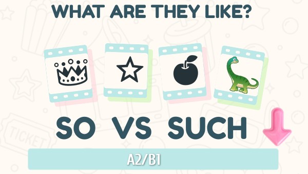 The aim of these activities is to introduce, learn or review the differene between 'so' vs 'such'. There is a brief grammar presenation on the differences between these expressions which are followed by a series of practial exercises to reinforce students' knowledge. All the activities aim at giving students a thorough practice and better understanding on when to use each of the expressions. The way to use the activities is self-explanatory, however each activity has the instructions for students in the headings.