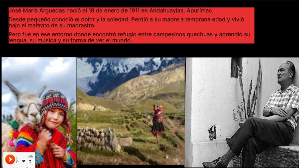 José María Arguedas nació el 18 de enero de 1911 en Andahuaylas, Apurímac. Desde pequeño conoció el dolor y la soledad. Perdió a su madre a temprana edad y vivió bajo el maltrato de su madrastra. Pero fue en ese entorno donde encontró refugio entre campesinos quechuas y aprendió su lengua, su música y su forma de ver el mundo.