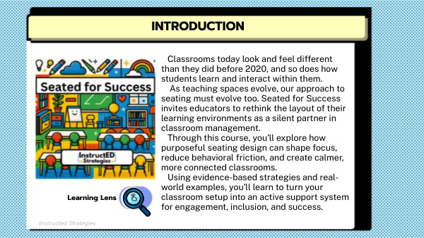 Classrooms today look and feel different than they did before 2020, and so does how students learn and interact within them. As teaching spaces evolve, our approach to seating must evolve too. Seated for Success invites educators to rethink the layout of their learning environments as a silent partner in classroom management. Through this course, you’ll explore how purposeful seating design can shape focus, reduce behavioral friction, and create calmer, more connected classrooms. Using evidence-based strategies and real-world examples, you’ll learn to turn your classroom setup into an active support system for engagement, inclusion, and success.