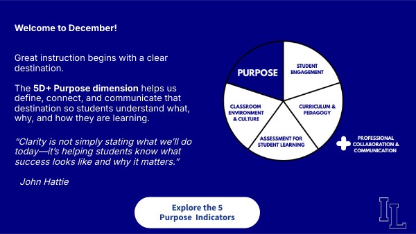 Welcome to December! Great instruction begins with a clear destination. The 5D+ Purpose dimension helps us define, connect, and communicate that destination so students understand what, why, and how they are learning.