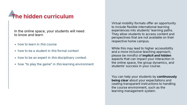 Virtual mobility formats offer an opportunity to include flexible international learning experiences into students’ learning paths. They allow students to access content and perspectives that are not available on their respective home campus. While this may lead to higher accessibility and a more inclusive teaching approach, please be mindful of implicit and hidden aspects that can impact your interaction in the online space, the group dynamics, and students’ success in your course.