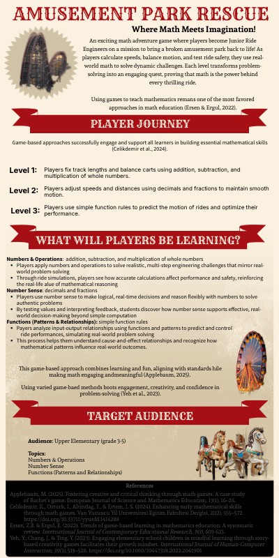 An exciting math adventure game where players become Junior Ride Engineers on a mission to bring a broken amusement park back to life! As players calculate speeds, balance motion, and test ride safety, they use real-world math to solve dynamic challenges. Each level transforms problem-solving into an engaging quest, proving that math is the power behind every thrilling ride. Using games to teach mathematics remans one of the most favored approaches in math education (Ersen & Ergul, 2022).