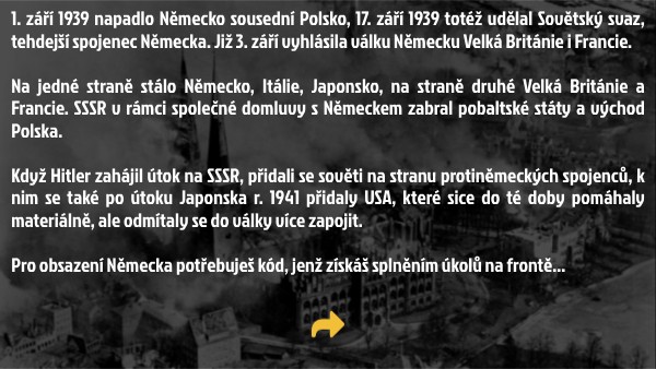 1. září 1939 napadlo Německo sousední Polsko, 17. září 1939 totéž udělal Sovětský svaz, tehdejší spojenec Německa. Již 3. září vyhlásila válku Německu Velká Británie i Francie. Na jedné straně stálo Německo, Itálie, Japonsko, na straně druhé Velká Británie a Francie. SSSR v rámci společné domluvy s Německem zabral pobaltské státy a východ Polska. Když Hitler zahájil útok na SSSR, přidali se sověti na stranu protiněmeckých spojenců, k nim se také po útoku Japonska r. 1941 přidaly USA, které sice do té doby pomáhaly materiálně, ale odmítaly se do války více zapojit. Pro obsazení Německa potřebuješ kód, jenž získáš splněním úkolů na frontě...
