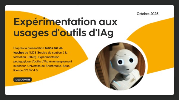 D’après la présentation Mains sur les touches de l'UDS Service de soutien à la formation. (2025). Expérimentation pédagogique d’outils d’IAg en enseignement supérieur. Université de Sherbrooke. Sous licence CC BY 4.0.
