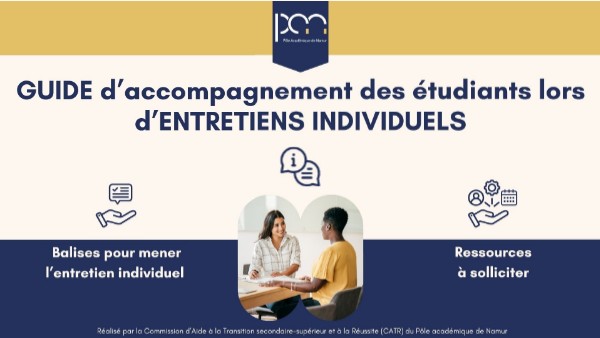 Ce guide a été conçu par la Commission d'Aide à la Transition secondaire-supérieur et à la Réussite (CATR) du Pôle académique de Namur et vise à outiller toute personne susceptible de recevoir un étudiant en entretien individuel en vue de faciliter son accompagnement quelle que soit sa demande initiale.