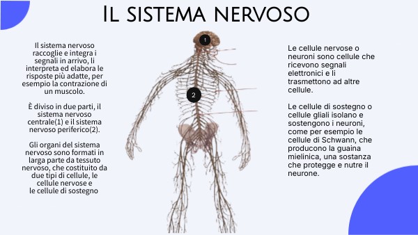 Il sistema nervoso raccoglie e integra i segnali in arrivo, li interpreta ed elabora le risposte più adatte, per esempio la contrazione di un muscolo. È diviso in due parti, il sistema nervoso centrale(1) e il sistema nervoso periferico(2). Gli organi del sistema nervoso sono formati in larga parte da tessuto nervoso, che costituito da due tipi di cellule, le cellule nervose e le cellule di sostegno