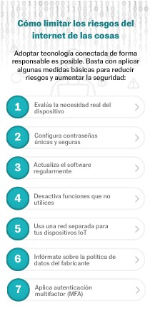 Adoptar tecnología conectada de forma responsable es posible. Basta con aplicar algunas medidas básicas para reducir riesgos y aumentar la seguridad: