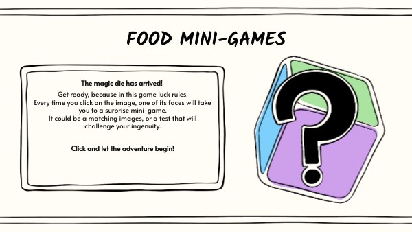 The magic die has arrived! Get ready, because in this game luck rules.Every time you click on the image, one of its faces will take you to a surprise mini-game.It could be a matching images, or a test that will challenge your ingenuity. Click and let the adventure begin!