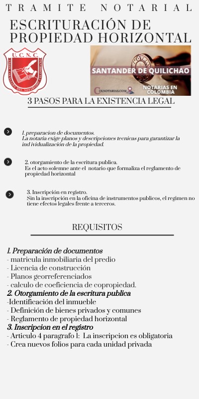 1. Preparación de documentos- matricula inmobiliaria del predio - Licencia de construcción - Planos georreferenciados - calculo de coeficiencia de copropiedad. 2. Otorgamiento de la escritura publica -Identificación del inmueble - Definición de bienes privados y comunes - Reglamento de propiedad horizontal 3. Inscripcion en el registro - Articulo 4 paragrafo 1: La inscripcion es obligatoria - Crea nuevos folios para cada unidad privada