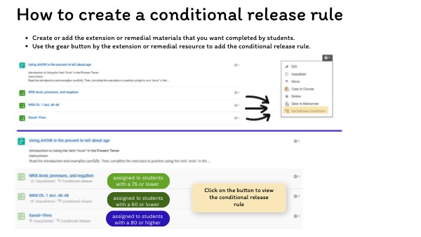 - Use the gear button by the extension or remedial resource to add the conditional release rule.