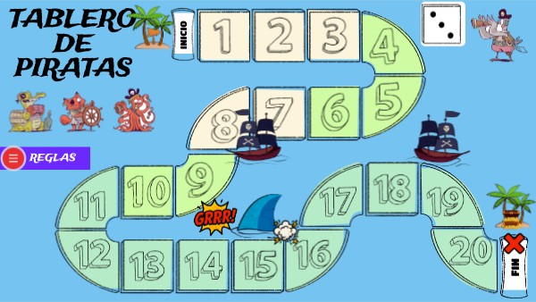 1) SI CAÉS EN UN CASILLERO CON EL COCODRILO PIRATA PODÉS AVANZAR LOS CASILLEROS QUE INDIQUE. 2) PERO SI CAÉS EN UN CASILLERO CON EL TIBURÓN, ¡CUIDADO! PORQUE RETROCEDES LOS CASILLEROS QUE INDIQUE. 3) ¡HAY QUE TENER MUCHO CUIDADO CON EL TIBURÓN PORQUE PUEDE HUNDIR EL BARCO! SI SE HUNDE TENÉS QUE VOLVER A TIRAR LOS DADOS.