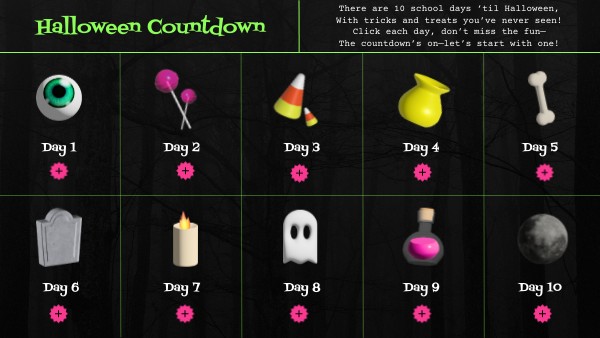 There are 10 school days ‘til Halloween, With tricks and treats you’ve never seen! Click each day, don’t miss the fun— The countdown’s on—let’s start with one!