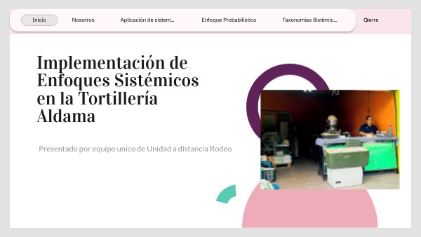 Bienvenidos a la presentación del proyecto Implementación de Enfoques Sistémicos en la Tortillería Aldama. Este trabajo tiene como objetivo aplicar la Teoría General de los Sistemas para analizar, comprender y mejorar el funcionamiento de una empresa local. A lo largo de este video exploraremos cómo los enfoques de sistemas duros, blandos y probabilísticos permiten optimizar la eficiencia técnica, fortalecer la comunicación humana y asegurar la sostenibilidad operativa de la Tortillería Aldama, ubicada en el municipio de Rodeo, Durango.