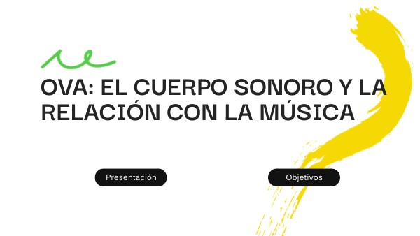 - Este OVA, tiene como propósito explorar cómo nuestro cuerpo funciona como un instrumento musical. A través de la observación y experimentación de sonidos internos (latidos, respiración, flujo sanguíneo), externos (golpes, palmadas, zapateo) y vocales (cantos, imitación de sonidos, técnicas como bocaquiusa), los participantes desarrollarán habilidades rítmicas, auditivas y motrices.