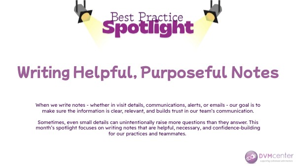 When we write notes - whether in visit details, communications, alerts, or emails - our goal is to make sure the information is clear, relevant, and builds trust in our team’s communication. Sometimes, even small details can unintentionally raise more questions than they answer. This month’s spotlight focuses on writing notes that are helpful, necessary, and confidence-building for our practices and teammates.