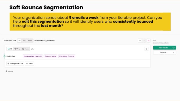 Since we already check for users who are unsubscribed to the email marketing channel, there are no other profile fields to add to this segmentation. Instead, consider where to find an email bounce. Try again!