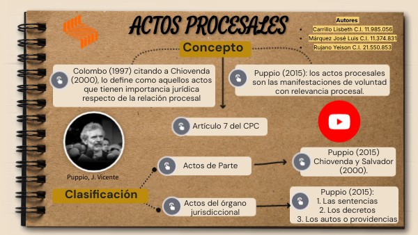 Por su parte, Colombo (1997) citando a Chiovenda (2000), lo define como aquellos actos que tienen importancia jurídica respecto de la relación procesal, esto es, los actos que tienen por consecuencia inmediata la constitución, la conservación, el desenvolvimiento, la modificación o la definición de una relación procesal", y agrega que pueden ser actos de uno u otro sujeto de la relación procesal, o sea actos de partes, o actos de órganos jurisdiccionales.'