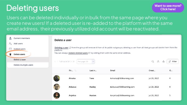 Users can be deleted individually or in bulk from the same page where you create new users! If a deleted user is re-added to the platform with the same email address, their previously utilized old account will be reactivated.